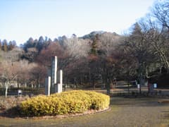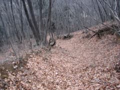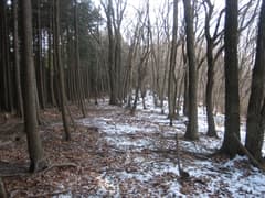 頂上から西へ一段下がると浅間大菩薩が祀られている。ここで西へ下る「せんげんの道」と稜線を辿る「するすみの道」に分かれる。するすみの道に入り、冬枯れの雑木林の尾根をしばらく辿る。杉林に入って石祠を過ぎると、道は左斜面を下って、やがて林道に出る。林道をずっと辿ると元の森林公園入口に戻るが、途中で右に分岐する林道に入り、三面コンクリートの沢沿いに下って、鳥谷戸(とりがいど)の集落に出た。