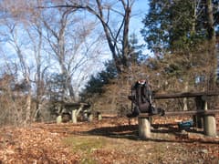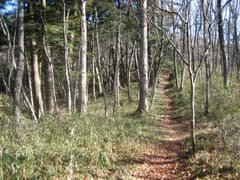 根古屋森林公園に入り、「いけづきの道」という道標に従って林間のキャンプ場を通り抜け、山道を登る。大きな針葉樹(なんだろう)の林がなかなかきれいだ。
