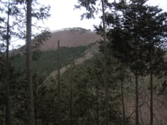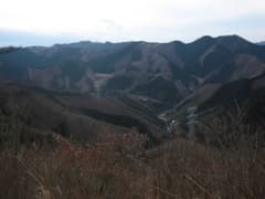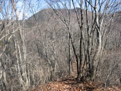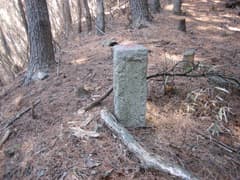 尾根道を下ったところには細い峠道が通っていて、傍らに「飛駒村有林」と刻まれた石柱が立っていた。先程の騒ぎで時間をロスしたこともあり、そろそろ日没の時間が気になって来て、先を急ぐ。杉林や雑木林に囲まれて、ところどころ木立の間から茫洋とした野峰の山容が見えるだけの、しぶーい尾根歩きが続く。