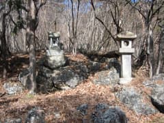 多高山の頂上には崩れた石祠、天明元年と刻まれた石灯籠、二等三角点とアンテナ塔がある。東に眺めが開けて、飛駒の里が俯瞰できる。標高の割には高度感のある山頂だ。ゆっくりしたいところだが、今日は多高山まで歩き通せたことで満足。麓にもぽつぽつ明かりが灯り始めたので、暗くならないうちに下ろう。