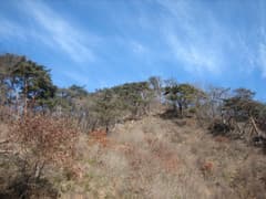 このあたりから群馬・栃木県境の稜線になり、屋根だけの潰れた石祠を見る。尾根上は小さなアップダウンが多くて、行く手の多高山の台形の頂上はなかなか近づいて来ない。急な斜面を灌木を頼りに攀じ登ると、「MHC 535m」という標識のあるピークに着いた。県境はここまで。一汗かいたので休憩する。冷たいミカンが美味しい。