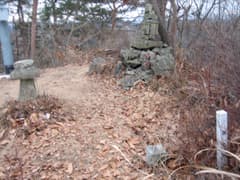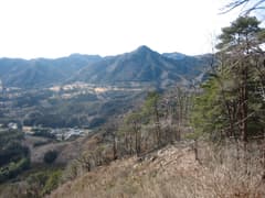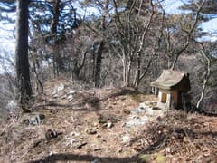 頂上から南東の尾根を下ると石祠のある岩場があり、さらに麓の眺めが良い。この先の岩場の下りは結構危ない。巻き道もあるようだが、先を急いでいたため見逃したようだ。