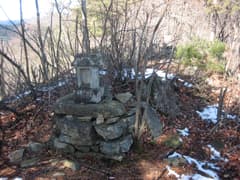 伐採地が終わると杉、松、雑木に覆われた尾根になる。そこはかとなく踏み跡があり、藪も薄い。露岩と赤松が点在する急な尾根をひと登りすると、石祠のある小平地に出た。石祠の屋根の前面に「宮神山」と刻まれているのは右書きだろう。台座には「寺沢、黒沢、鳥谷戸」と麓の集落の名が刻まれていた。木立に囲まれて展望は限られるが、西には遠く鳴神山、東には眼下に山麓の黒沢の集落が見える。
