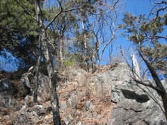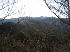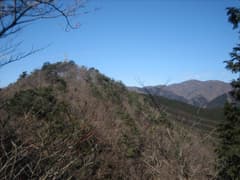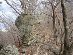 雪が残るピークは風当たりが強く寒いので、休憩もそこそこに先に進む。山名のとおり、露岩の多い痩せた尾根の小さなアップダウンが続く。ちょっとした岩尾根を攀じ登って、のこぎりの中央のピーク(取り敢えずここでは主峰と呼ぶ)に登り着いた。主峰も樹林に囲まれて展望に乏しい。木立の間から、かろうじて遥か遠くの野峰を眺めた。