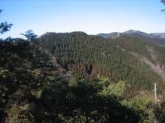 送電鉄塔から杉林の尾根を少し辿ると、野峰から多高山へ続く主稜線上のピークに出た。ピークといっても、杉林の中に何かの境界標石があるだけの、全く特徴のない場所だ。ここから多高山へ南西に向かうところを、間違えて西に落ちる尾根を暫く辿るが、すぐに気が付いて、斜面をトラバースして正しい尾根にのる。