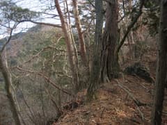 ここからのこぎり山にどう登るかは、事前の情報がない。取り敢えず、本堂左手のコウヤマキの大木(これも推定樹齢400年)の横を通って、杉林の中に入る。とにかく上を目指すと雑木林になり、岩場に突き当たる。ここは直登できないので左に回り込むと、細いながらも明瞭な踏み跡があった。