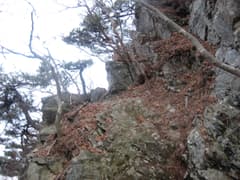 主峰から左に折れて、立ち木を摑みながら急な斜面を下る。ここはかなり急なので、補助のロープがあった方が良かったかも知れない。次のピークも岩場があるが、ここは左に巻く踏み跡がある。626m標高点の位置は気付かずに通過してしまった。