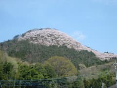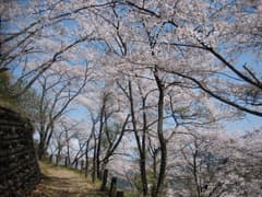 昼食を終え、さらに下って柄杓山に向かう。杉林の中の少し急な尾根を下ると、柄杓山城跡の駐車場からの遊歩道と合流した。ここからはお花見に来た人の行き来が多い。満開の桜の並木が青空をバックにして素晴らしい。頂上の本丸跡の広場では、団体さんや家族連れがお弁当を広げていた。
