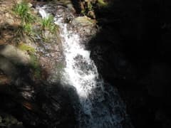 林道を登って行くと、「水源の森 日本百選 / 名水 西方寺沢の水 / ここから三十分」と書かれた古い案内標識があり、古い林道が分岐して沢沿いに続いている。これを登って杉林の中をしばらく行くと小滝がある。飛沫に日光が反射して奇麗だったので、近寄って撮影してみた。
