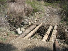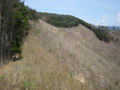 杉林を抜けると伐採された広い谷に出て、稜線まで眺めが開ける。沢を渡る丸太橋があり、その手前に軽自動車が停まっていた。もしかして、誰か登っているのかな。