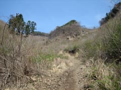 作業道を左に進む。道は枯れ草とイバラに覆われて、ほとんど消えかけている。すぐ上には吾妻山〜鳴神山縦走路の稜線が見えているが、藪漕ぎはなるべく避けたいので、遠回りでも作業道を辿る。振り返るとピンク色の柄杓山と、桐生川を隔てて仙人ヶ岳が見える。作業道を斜め左上に登って行くと新しい林道に出て、ようやく歩きやすくなる。