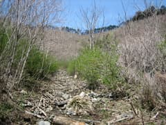 林道は、枯れ木と枯れ草に埋まった沢を渡って、さらに先に延びている。この沢が西方寺沢の本流のようだ。確かに、夏には猛烈な藪になりそう。左岸に古い作業道があるので、これを辿る。沢の中を歩くよりは楽だろう。しかし、この道はすぐに西方寺沢に突き当たって終わりとなり、あとは沢の中を歩く。幸い、沢は幅が広く、藪を漕ぐこともない。ちょっとだけ、沢登り気分を味わう。ところどころに新しい靴跡を見るのは、件の軽の主のようだ。