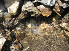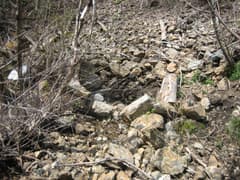 良く燃えそうな枯れ木と砕石がゴロゴロした沢を遡って行く。かなり稜線が近づいても水量は豊富だ。やがて、沢はガレに突き当たり、その下からバンバン水が湧き出ていた。ここが源頭の水源に違いない。ザックを下ろして、早速、コッヘルで汲んで飲んでみる。まろやかでクセのない、おいしい水だ。