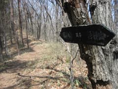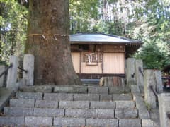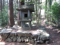 桜の林が終わると杉林になり、大きな石祠が祀られていた(2008-04-14追記:雷電神社というそうです)。Y字の分岐は右に進み、「柄杓山城跡遊歩道」の案内板を見て杉林を下ると、日枝神社に着いた。