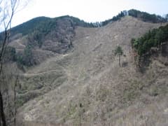 水源の近くにはヌタ場もあった。水源はくまさんや、いのししさんの水場にもなっているのだろう。再び現れた古い作業道を辿って登ると、山腹を横断するこれまた古い作業道に出た。周囲を見渡すと、広大な伐採地のあちこちにジグザグに付けられた作業道の跡が見える。伐採地の斜面の途中に人影を発見。軽の主のようだ。タラノメでも採っているのかな。