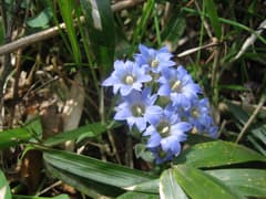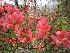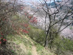柄杓山頂上から日枝神社への下山道も、木の階段が良く整備されたハイキングコースだ。桜の他にヤマツツジも咲き始めている。下生えのササの中には、小さなフデリンドウがあちこちに咲いていた。麓に近い桜は散り始めていて、花吹雪が奇麗だ。