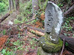行く手には金沢峠付近の稜線が高い所に見えて、意外に山奥深い感じがする。林道は舗装が途切れて、大崩林道と名前を変えて奥へ延びている。樹林に覆われた谷間に入り、林道が左に大きく曲がるところで、右に木橋を渡って山道が分岐する。山道に少し入った場所には、「左 御嶽 石尊宮」と刻んだ石碑があった。左は三峰山に通じる道で、『野山歩きのヒント』(桐生タイムス社)の「川内大崩から梅田忠霊塔」の項の記述によると、途中には宗教モニュメントが多いらしい。興味を引かれる。
