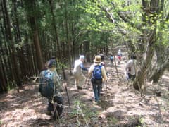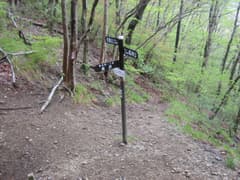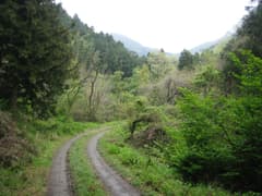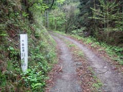 その先の山道は藪っぽかったので、戻って林道を歩く。すぐ先に林道の分岐があり、右に進む。このあたりには山菜を採りに車で来ている人達もいた。