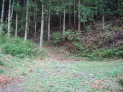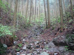 林道を詰め上がると、右にカーブする所で左に小さな沢に沿った山道が分かれる。林道はすぐ先で終点なので、この山道が金沢峠への峠道のようだ。道標の類いは全くない。峠道はあまり歩かれた形跡はないものの明瞭で、小沢を渡る個所には木橋が架かっている。しかし、小沢に沿って登るにつれ、だんだん道型が薄くなる。