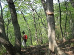 木の幹に赤ペンキで「←孕八」と意味不明の文字が書かれている二股に到着。踏み跡を辿って、右の沢を登ってみる。しかし、道は落ち葉に完全に埋もれて、見失う。しかも、沢は大形山の頂上の方向に上がって行くようだ。これはまずそうなので、先程の二股まで引き返して左の沢を詰め上がると、金沢峠の僅かに北の稜線に這い上がった。最後は怪しいハイキングコースだった。なお、峠から下るときは、峠道を辿って落ち葉に埋もれた谷に降りたら、その谷を下ると件の二股に出るようだ。