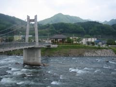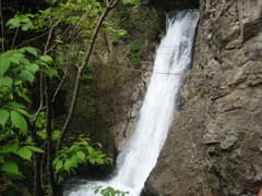 水上駅前から温泉街を抜けてR291を横断し、阿能川沿いの車道を赤谷越に向かって歩く。開けた谷をゆったりと流れる阿能川は、上越新幹線のシェルターを過ぎた少し先で急に深いゴルジュとなって、中に高さ約20mの稲荷滝を落としている。車道から階段を降りると朱塗りの欄干の橋があり、滝全体を眺めることができる。水量が多く、迫力ある滝だ。下流にも深い釜を持つ2段の滝が連続する。滝の上流は再びゆったりとした流れに戻る。