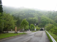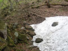 関越道の高架の下をくぐって、山間に入って行く。周囲の山の鮮やかな緑を眺めながら進めば、少々長い車道歩きも結構楽しい。カーブの連続を登って、仏岩トンネル手前のパーキングエリア(仏岩ポケットパーク)に到着する。WCや東屋があり、片隅には除雪で溜まった雪がわずかに消え残っていた。