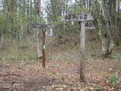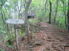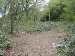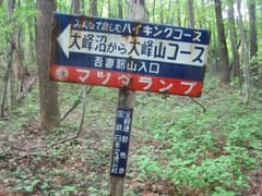 赤谷越峠から樹林に覆われた縦走路をゆるゆると登る。途中で大峰沼への近道が左に分岐するが、危険のため通行禁止になっている。大きな電波塔を過ぎると車両も通れそうな幅広い道になって、電柱が立つ傍らに大峰山の二等三角点があった。予想しなかったそっけない山頂の様子にちょっとびっくり。