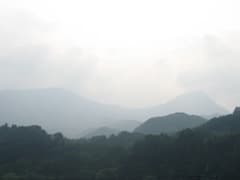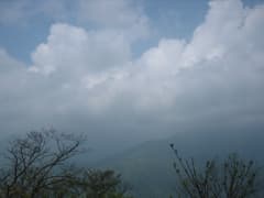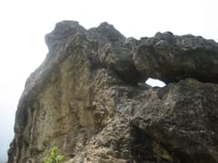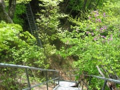 一休みして吾妻耶山に向かうと、すぐに仏岩の基部に着く。ザックを下ろして、仏岩に登ってみる。2段の細い鎖がかかっているが、その上は急峻なので、てっぺんまで登るのは止めておく。岩がボロボロで、崩落には注意。眼下の谷は新緑一色に染まって奇麗だ。吾妻耶山の頂上も見えるはずだが、今日はあいにく雲の中に隠れている。
