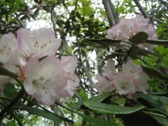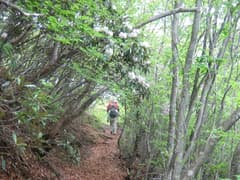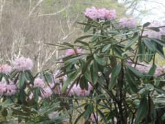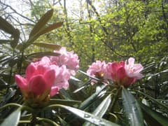 吾妻耶山への稜線歩きに戻る。仏岩で道草している間に6人パーティに追いつかれて、前後して登る。稜線にはミツバツツジやシャクナゲがたくさん咲いている。稜線上の難所を右から巻くと、山頂に向かって急登となる。シャクナゲはこの辺りが旬だ。花をつけた株は一部だが、咲いている所はかたまっているので、なかなか見事。