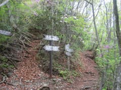 この先にも電波塔が間隔を置いて建ち並ぶ。途中に鉄製の2階建て展望台があるが、周囲の木々が育ってしまって、展望は全くない。右に車道を分け、電波塔の脇を通って稜線を直進すると、再び山道となる。ここからは新緑の中、ところどころミツバツツジが咲く気分の良い道だ。