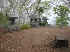 台地に上がれば、吾妻耶山の頂上へは僅かな距離だ。頂上は岬の先端のような場所で、高さ2mほどの大きな石祠が3つ並んで鎮座している。徐々に晴れ間が広がって、眼下には水上の温泉街が見えるが、谷川連峰の方向はまだ雲の中だった。まあ、今回は展望がメインの山行ではないので、これだけ天気がもてば吉としよう。