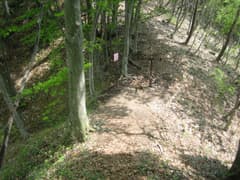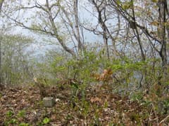 稜線からガレ沢(地滑りによる地割れ?)に入って少し登ると、頂上台地の一角に登り着く。台地の上はミズナラやカラマツの林で、地形図では平坦そうに見えるが、実際は小さな凹地(これも地滑りに起因?)があちこちにあって波打つような地形になっている。