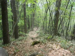 稜線左側は新緑真っ盛りの樹林で、ところどころ木の間から大峰沼の水面が見える。緩く下ると大沼越に着き、瑞々しい緑の林間をさらに下って、大峰沼の湖畔に到着した。