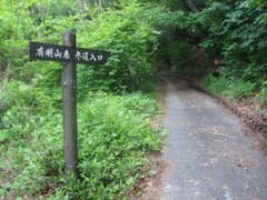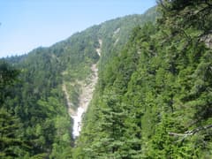 急な下りが延々と続くが、漸く傾斜が緩むと右に三段の滝への道が分岐する。滝は表参道で堪能しているので、有明荘に直行する。新緑が美しいカラマツ林と笹原の中を下ると、有明荘の裏手にあるヘリポートに降り着いた。