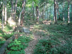 山道に入り、木橋で渓流を渡ると、後は黒川沢の右岸を登って行く。道は細いが良く踏まれていて、道標も随所にある。南東に開けた谷なので、早朝でも陽が差し込んで雰囲気は明るい。谷の両側は急峻な斜面で、一か所、雪が残る崩壊地のトラバースがあった。落石には注意。
