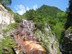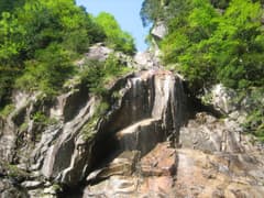 小滝を見て、赤ペンキの丸印に導かれて左岸に渡ると「妙見の瀧」と記した道標があり、そのすぐ先に右岸から妙見の滝が落ちていた。水が飛沫をあげながら岩壁を流れ下る様は、涼味満点だ。