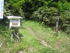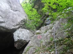 登山道はここで谷から離れ、右側の草付き急斜面の鎖場を登る。なお、ルート地図の背景地図(電子国土)に記載されている妙見滝と白河滝の位置は誤っていて、実際はもっと下流になるのではないかと思う。