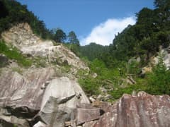 滝の水を汲んでポリタンを満タンにし、さらに本流を遡る。谷はU字に狭まり、大きなチョックストーン滝を右から新品の鎖で越える。次のナメ滝を左から越えると谷が開けて、見渡す限り白い巨岩で埋まっている。左側の山腹に大きな崖崩れがあり、ここが崩壊現場らしい。割れた岩のまだ鋭利な岩角が、崩壊の様子を生々しく伝えている。