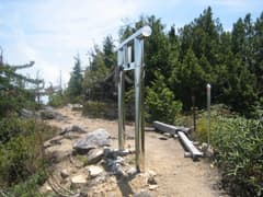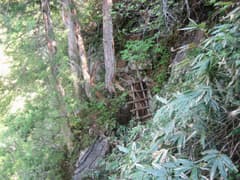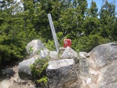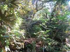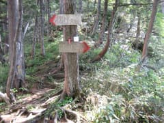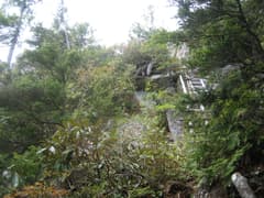 稜線に出れば後は多少は楽な道になるのかと思ったら、そうは問屋が下ろさない。針葉樹林に覆われた岩場の多い急登が続く。山岳信仰の祠や石碑が点在する。岩場には木の梯子が架けられているが、老朽化したものが多いので注意。登り始めて4時間以上が経過し、エネルギー切れを起こしたようで、足が重い(^^;)。結構、へろへろになって、真新しい金属製の鳥居が建つ北岳に到着した。この鳥居は避雷針を兼ねているそうだ。