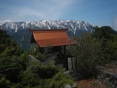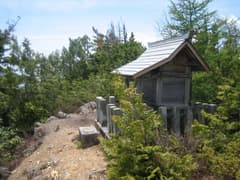 エネルギー補充が完了した所で、さらに先の南岳までデジカメだけを携行して空身で往復する。針葉樹林に覆われた岩稜の道は意外と険しい。南岳の社殿もなかなか立派だ。社殿の前は東側に眺めが開けて、やはり安曇野が俯瞰できる。安曇野からも、この社殿を遥拝することができるのかも知れない。元の道を北岳まで戻った。