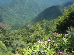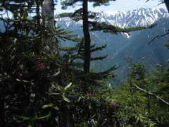 北岳から裏参道を中房温泉方面に下る。最初は北へ稜線を下り、2283m峰の手前から西へ、山腹を巻く様に下って行く。後は下り一方かと思いきや、岩場や崖を避けるためにアップダウンが結構ある。途中、岩場を鎖でトラバースする個所もあり、慎重に歩く。途中には一面のシャクナゲ林もあるが、もう時期も過ぎているのか、花はポツポツだった。