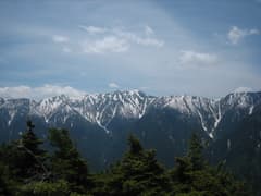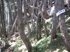 シャクナゲの木が多い針葉樹林に入り、木の根とロープが頼りのものすごい急登が始まる。点々と石碑があり、かつての行者道であることを偲ばせる。有明山の頂上稜線が見えて来て、雪が残るルンゼが急角度で駆け上がっている。山道の周囲も転げ落ちそうな急斜面で、気が抜けない。