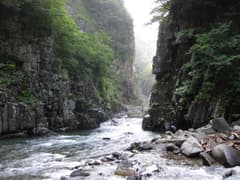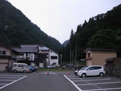 桐生を深夜に車で発ち、関越道赤城IC〜湯沢IC、R353十二峠を経由して、夜明け前に清津峡温泉に到着。温泉街入口の広い無料駐車場に車を置き、WCを済ませて出発する。温泉街の裏通りを行くとすぐに登山口で、見覚えのある案内看板の他に小さな立て札があって、何やら書いてある。なになに「残雪と落石のため八木沢には通り抜けできません」だって、ガーン。しかし、いくら豪雪地帯とは言え、7月中旬にもなって標高の低いこのルートに雪はないだろう。もしだめな場合は引き返す覚悟も決めて、進むことにする。