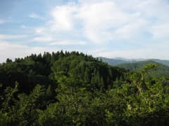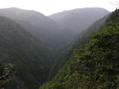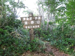 十二大明神の石碑のある辺りからブナ林となり、クモの巣を払いつつゆるゆると登って行く。やがて灌木に覆われた頂上稜線に登り着いて、緩やかな登降となる。しばらく行くと「清津峡歩道 / 足もと注意 / 環境庁 新潟県」と書かれた立派な木製の道標があり、さらに2、3分進むと同じ作り方で「温泉のぞき」という道標があった。その名のとおり、清津峡の温泉街を眼下に見ることができる。