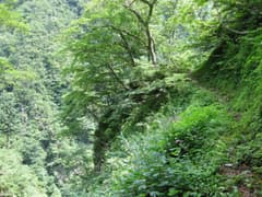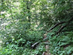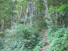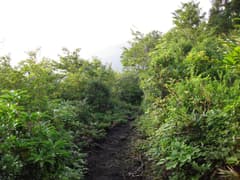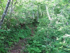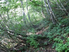 緩く小さなアップダウンのある尾根道が続く。道は深い灌木の藪をきれいに切り開いて付けられている。しかし、路面は苔むしていて、歩かれている雰囲気があまりない。やがて、稜線の左斜面(清津峡側)をトラバースする道となる。根曲がりの樹林が冬の雪の重みを物語る。道型ははっきりしているが、傾いた路面が滑りやすい。