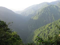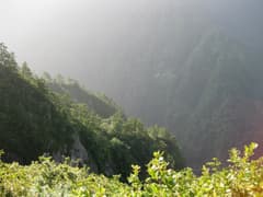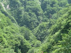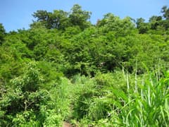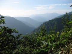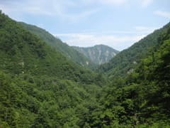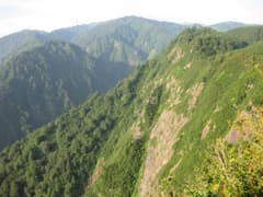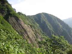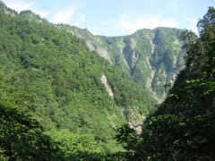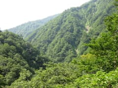 まだ薄暗い山腹の林間をジグザグに登る。道は細いが明瞭だ。やがて尾根を登るようになり、清津峡の対岸の稜線から靄でぼやけた太陽が昇る。今日は暑くなりそうだ。森林に覆われて展望はないが、一カ所、左側に清津峡の深いV字谷が見おろせる場所がある。一方、右側の樹林越しに見える谷(大松沢)は大きな崩落があり、治山工事中のようだ。