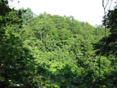 トラバース道から再び尾根道になり、ブナ林の中を登って行くと「満寿山」の道標のあるピークに着いた。樹林に囲まれて、頂上という感じがあまりしない場所だが、道標の裏手からは清津峡の展望が素晴らしい。足尾沢川出合付近の清津峡は深いV字谷となり、その底に切れ切れに水流が見える。満寿山から日向の肩への稜線の直下は、清津川に向かって切れ落ちたスラブとなっている。ただ、今日は湿度が高く靄がかかっているので、ここに来るのは空気が澄んだ紅葉の時期がベストかも。