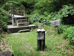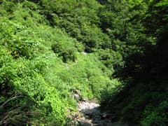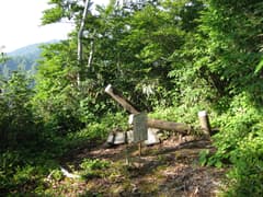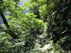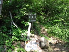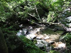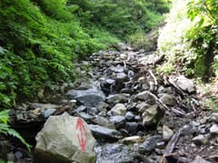 ガレ沢から20分程進むと、道の脇に「高石沢」という古い道標があり、そのすぐ先で水量の多い高石沢に突き当たる。小滝をかけた涼しげな沢だ。比較的新しい赤テープに導かれて、沢に沿って上流に向かうと、沢にロープが張り渡されていて、飛び石伝いに流れを渡ることができた。この辺りは、道の整備がされているようだ。しかし、降雨時はここが渡れなくなる可能性が高い。