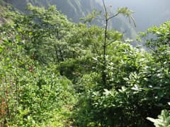 清津峡温泉から日向の肩までは特に危険な個所はなく、お勧めのハイキングコースである。しかし、日向の肩から足尾沢橋までの下りは「十分にご注意」どころのレベルでなく、凄かった。頂上直下から滑りやすい急な土の道を、ロープを頼りに下って行く。このロープが年代物の麻縄?で、なんと苔が付いている(^^;)。こんなロープに体重を預けても良いのだろうか。もし切れたら止まる術はなく、断崖絶壁からダイブである。引き返そうかとも考えたが、とにかく慎重に、ロープに余計な負荷をかけないように下る。途中、アルミ梯子が架けられた個所もあるが、こちらは土砂に埋もれて用をなさない状態だった。