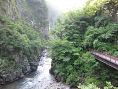 清津峡沿いの歩道は、かつて落石事故があったために閉鎖され、代わりにトンネルで探訪できる(500円)。トンネルの途中の4カ所から、渓谷の壮大な柱状節理の岩壁を見ることができる。